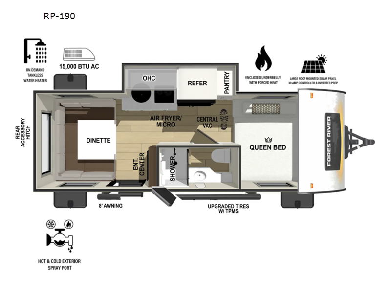 With any R-Pod travel trailer by Forest River, you will enjoy affordable luxury at the lowest tow weight in its class! There is a sealed underbelly with forced heat, a curved dual-pane acrylic front window with a bug screen and night shade, plus a large roof mounted solar panel for off-grid capabilities. The 15K A/C unit will keep you comfortable during the summer camping months, and the tankless water heater will provide endless hot showers after hiking, biking, swimming and more! Each model also includes a black glass friction hinge entrance door, roof ladder prep, exterior motion lighting, plus a hot and cold exterior spray port to wash off sand from the beach. Inside, you'll enjoy seamless Surf-X kitchen countertops, blackout roller shades, and a central vacuum system for hassle-free cleaning!