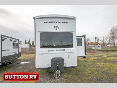 With each Sandpiper Destination Trailer by Forest River you will enjoy many luxurious features, such as crown molding over the kitchen cabinets, solid surface kitchen countertops, a memory foam mattress, plus so much more. The extra large picture windows throughout let natural light in and provide beautiful outdoor views, and each model includes three or more slides for added interior space. You'll find many exterior conveniences, like the porch light with an interior switch, the rain gutters with extra long drip spouts to prevent black streaking, and an electric awning with LED light strip, plus more! You will stay comfortable year around with dual 15,000 A/C units plus each model is constructed with an Underbelly Armor for better protection and insulation!
