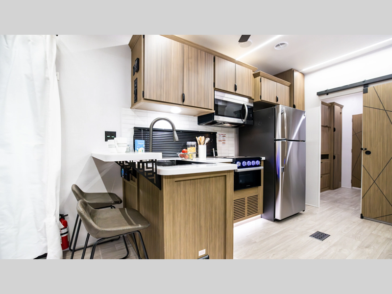 Sleeps 3 Slides 2 Length 37 ft 9 in Ext Width 8 ft Ext Height 12 ft 8 in Int Height 7 ft Hitch Weight 1335 lbs Dry Weight 9234 lbs Cargo Capacity 2301 lbs Fresh Water Capacity 40 gals Grey Water Capacity 40 gals Black Water Capacity 40 gals Available Beds King with Versa Tilt Cooktop Burners 3 Number of Awnings 1 Water Heater Type Tankless AC BTU 15000 btu Awning Info 21' with 4K Blade Lighting Axle Count 2 Shower Type Walk-In Shower Similar Floorplans