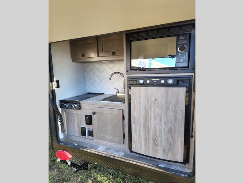 Sleeps 2 Length 13 ft 6 in Ext Width 8 ft 6 in Ext Height 8 ft 2 in Int Height 4 ft 11 in Interior Color Grotto, Gray, Red, Turquoise Exterior Color White, Gray, Red, Black, Blue, Yellow, Orange Hitch Weight 195 lbs Dry Weight 1795 lbs Cargo Capacity 1900 lbs Fresh Water Capacity 22 gals Cooktop Burners 2 LP Tank Capacity 20 lbs Water Heater Capacity 6 gal Water Heater Type DSI Gas Axle Count 1 Number of LP Tanks 1